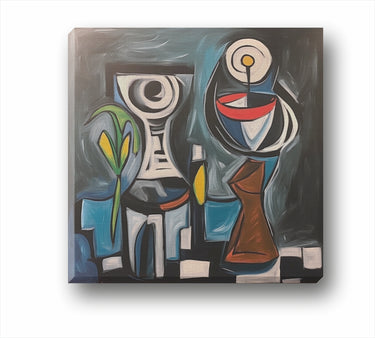 Натюрморт 8300702 с бутилка вино в с елегантна игра на форми и цветове. Рисунка с пастел в стила на Пабло Пикасо