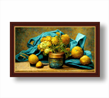 Нашата картина Натюрморт 8200605 е една игра с цветове и форми. Рисунка с пастели, вдъхновена от стила на експресионистите.